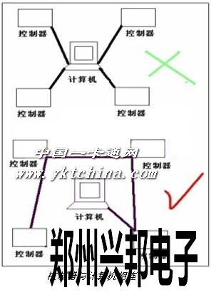 控制器通訊線(包括485/422、232和韋根等通訊線)必須采用國際通用的8芯屏蔽雙絞線,這樣可有效防止和屏蔽干擾。線徑大于0.3mm總線長度不超過1200建議在1000米以內(nèi),如果更長請選用其它專用485/232轉(zhuǎn)換器或者加中繼器,并選用更粗的通訊電纜。控制器GND 485- 485+分別對應連接485轉(zhuǎn)換器GND TD(A) TD(B),通訊線路采用串聯(lián)掛接式連接,請勿采用星型連接或者局部星型連接(如圖)。