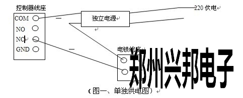 2、 鎖到控制器的連接線需采用2芯電源線,控制器到鎖距離不可以超過100米,線徑大于1.0 mm。如有需門磁檢測線則需多2芯線。(可根據(jù)現(xiàn)場需要定)。如果輸出12V電源有明顯降壓則可以微調(diào)電源電壓到13.6V或單獨(dú)給電鎖供電(如圖一)。