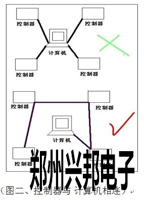 控制器GND 485- 485+分別對應(yīng)連接485轉(zhuǎn)換器GND TD(A) TD(B),通訊線路采用串聯(lián)掛接式連接,請勿采用星型連接或者局部星型連接(如圖二)。如果線路過長和設(shè)備過多,請?jiān)谧詈笠慌_設(shè)備上增加終端電阻(有跳線加載)總線最多可掛接128臺控制器。