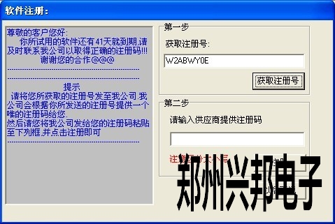 軟件安裝完成后有一個月的試用期,當過了試用期后軟件就打不開了,所以在試用期結束前就要注冊軟件,軟件注冊時首先在軟件的幫助-軟件注冊中獲取一個注冊號,如下圖所示,把獲取到的注冊號發到公司,公司會提供一個注冊碼,把注冊碼復雜粘貼到第二步的注冊碼中,點擊注冊就可以了。如果軟件已經過期獲取不到注冊號,那么就要通過一個小插件獲取注冊號,在插件上進行注冊就可以了。