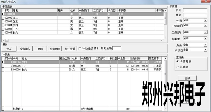 1.485軟件打開后,點一下卡管理--補助入卡--補助入卡輸入,打開補助入卡輸入窗口,在右卡信息中輸入想要添加的人員條件后,點擊下面的查詢,然后在左邊的補助金額后面的框中填寫補助金額,可以選擇是否清零,若選擇補助清零,在領(lǐng)取補助時會將卡上的金額先清零再補助上此次的金額;若選擇不清零,則在領(lǐng)取補助時會累加之前卡上的金額。點擊全部加入,就給選出來的人員生成補助.關(guān)閉此畫面,如下圖所示。
