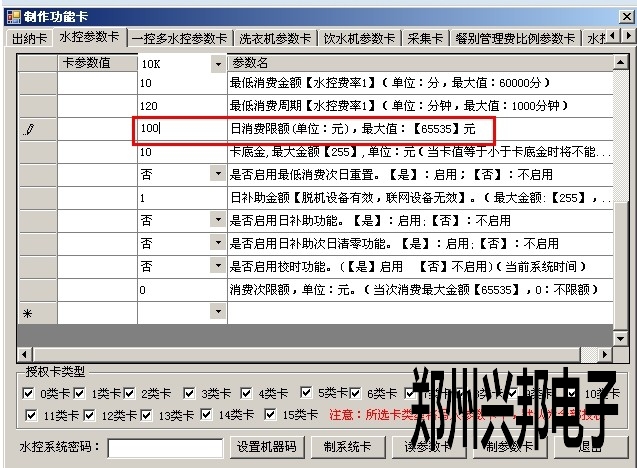 2)打開軟件 制卡中心-功能卡制作-水控參數(shù)卡中的日限額,輸入要設置的值,以元為單位,如下圖所示,代表100元,最大可設置到65535元,設置好后點擊制參數(shù)卡即可;