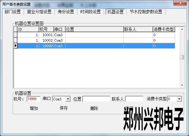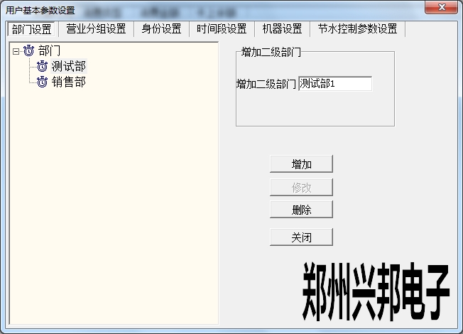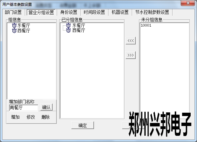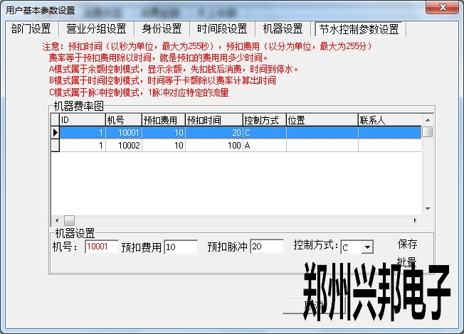在使用興邦一卡通平臺(tái)用戶基本參數(shù)設(shè)置中有部門設(shè)置、營(yíng)業(yè)分組設(shè)置、身份設(shè)置、時(shí)間段設(shè)置、機(jī)器設(shè)置、節(jié)水控制參數(shù)設(shè)置。下面依次為其說明。