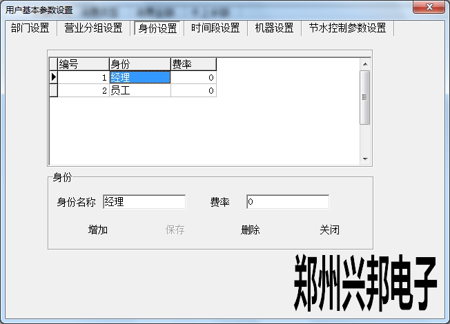 身份設(shè)置是對(duì)持卡人身份的說明,通過讀卡可以看到此人的身份。直接輸入身份名稱,費(fèi)率填寫0,暫不起作用,點(diǎn)擊增加,增加成功后,選中信息進(jìn)行雙擊可以對(duì)身份名稱進(jìn)行修改,也可以刪除。
