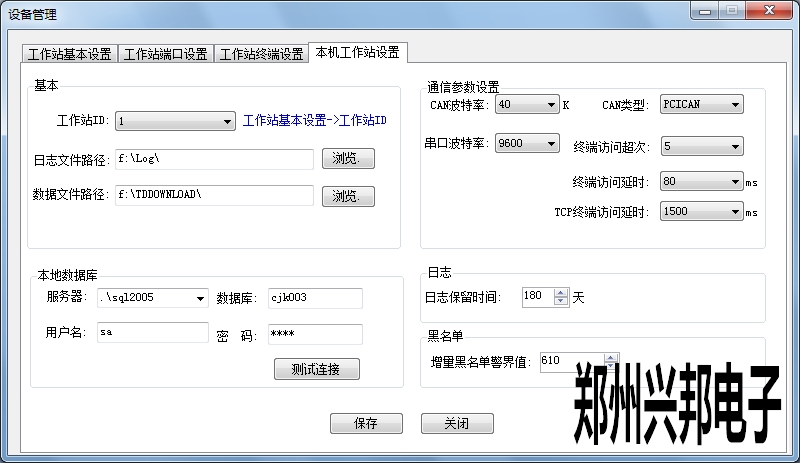 本機(jī)工作站設(shè)置:工作站ID即選擇工作站基本設(shè)置中添加工作站的ID號(hào),下面選擇存放日志文件和數(shù)據(jù)文件的地址;通訊參數(shù)設(shè)置中CAN波特率默認(rèn)為40K,串口波特率默認(rèn)為9600,此處設(shè)置不對(duì)會(huì)導(dǎo)致機(jī)器不通訊。終端訪問(wèn)超次從1到100,默認(rèn)為5,終端訪問(wèn)延時(shí)從10ms到6000ms,默認(rèn)為20ms,此處設(shè)置會(huì)影響監(jiān)控平臺(tái)下載參數(shù)和上傳記錄的速度,一般使用默認(rèn)值;本地?cái)?shù)據(jù)庫(kù)設(shè)置中服務(wù)器選擇數(shù)據(jù)庫(kù)2005的服務(wù)器名,數(shù)據(jù)庫(kù)填寫(xiě)創(chuàng)建采集庫(kù)的數(shù)據(jù)庫(kù)名稱,用戶名sa,密碼為hnzz,設(shè)置后點(diǎn)擊測(cè)試連接,看能否連通;日志保留時(shí)間和增量黑名單警界值可以自主更改。