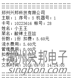2) 時(shí)間段消費(fèi)模式:以24小時(shí)為準(zhǔn),最多可設(shè)置8個(gè)時(shí)間段費(fèi)率,每個(gè)時(shí)間段可設(shè)置對(duì)應(yīng)的菜肴、份數(shù),將費(fèi)率設(shè)置好之后在自動(dòng)模式放卡即可自動(dòng)扣除相應(yīng)費(fèi)用。只有計(jì)算和自動(dòng)模式可以用,計(jì)算模式只作為查看使用,不能扣費(fèi)。若連接的有打印機(jī),可打印消費(fèi)明細(xì),打印出來(lái)的消費(fèi)明細(xì)格式如下圖所示: