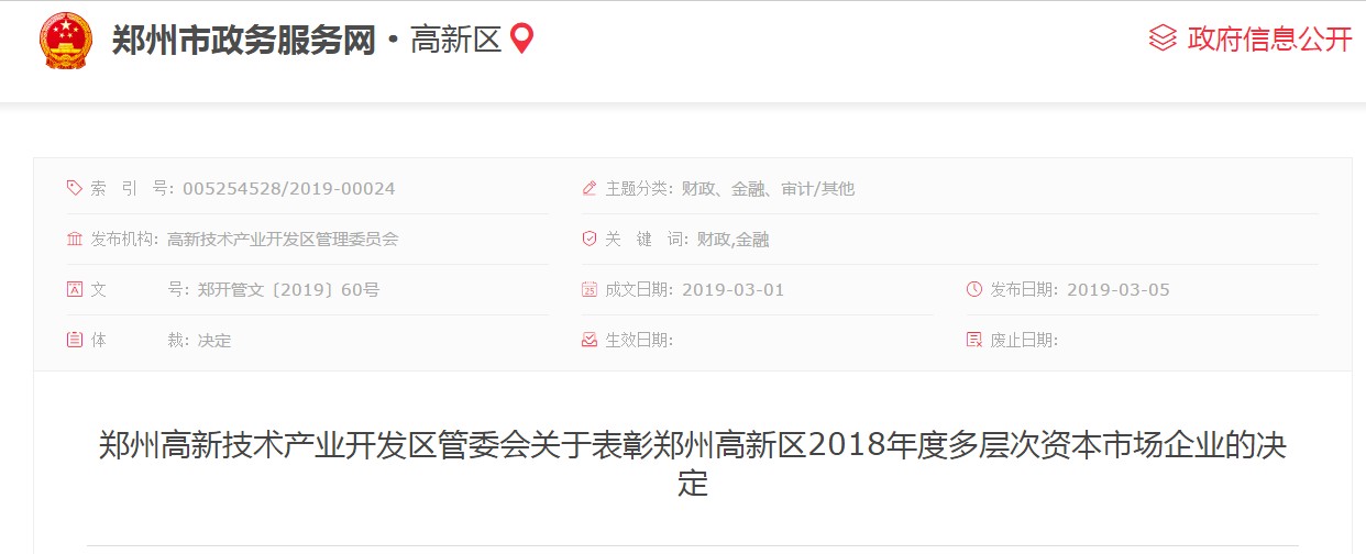轉發:鄭州高新技術產業開發區管委會關于表彰鄭州高新區2018年度多層次資本市場企業的決定